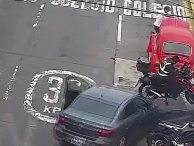 Cámaras de seguridad de la Av. República de Panamá en San Isidro, grabaron el preciso momento en el que un vehículo fuera de control termina embistiendo a dos personas que se encontraban con sus unidades estacionadas en la vía.