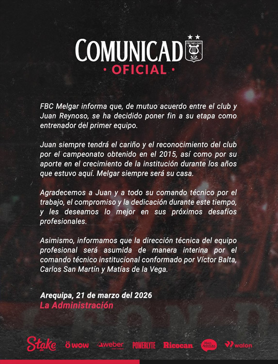 El FBC Melgar de Arequipa hizo oficial el final del ciclo de Juan Reynoso como entrenador del primer equipo. En un amplio comunicado, informó que la decisión se tomó de mutuo acuerdo entre ambas partes, poniendo fin así a su segunda etapa en la institución.