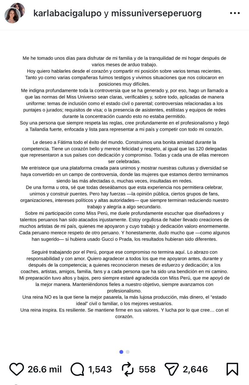 “Construimos una bonita amistad durante la competencia. Ella tiene un corazón bello y merece felicidad y respeto, al igual que las 120 delegadas que representaron a sus países con compromiso”, escribió Bacigalupo. La modelo cerró su comunicado asegurando que seguirá trabajando por el Perú, reafirmando su compromiso con la representación nacional y con la defensa de la transparencia en los certámenes de belleza.