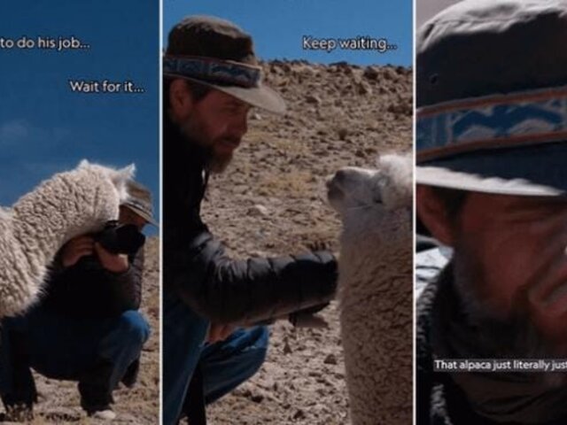 La reacción del profesional no se hizo esperar, exclamando entre risas y sorpresa: “Oh, por Dios. La alpaca literalmente me escupió en la cara”, mientras se limpia el inusual "saludo".